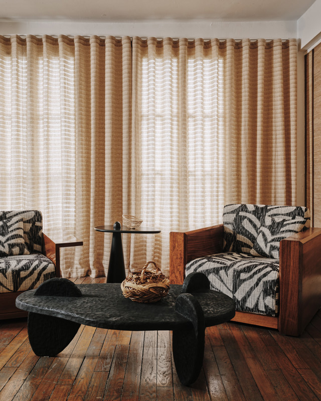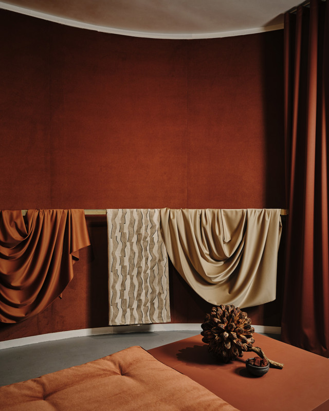 Sweeping curtains and walls clad in handcrafted natural wallcoverings created an immersive environment, revealing a collection that feels both worldly and distinctly contemporary.